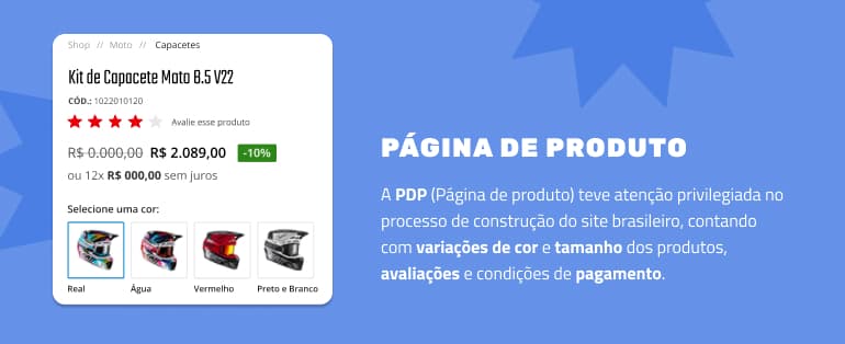 *A PDP (Página de produto) teve atenção privilegiada no processo de construção do site brasileiro, contando com variações de cor e tamanho dos produtos, avaliações e condições de pagamento.