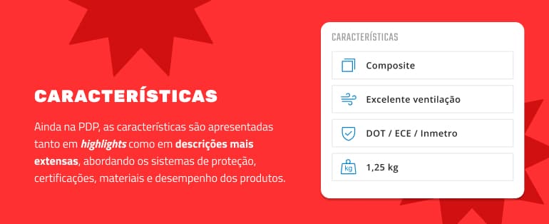 *Ainda na PDP, as características são apresentadas tanto em highlights como em descrições mais extensas, abordando os sistemas de proteção, certificações, materiais e desempenho dos produtos.